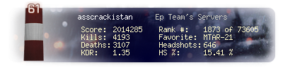 | Headshots | 905 | Suicides | 98 | Headshot / Kill | 16.18 % |