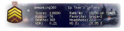 | Headshots | 23 | Suicides | 12 | Headshot / Kill | 28.75 % |