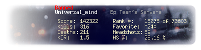 | Headshots | 89 | Suicides | 1 | Headshot / Kill | 28.16 % |