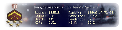 | Headshots | 57 | Suicides | 3 | Headshot / Kill | 25 % |