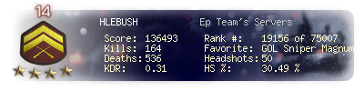 | Headshots | 50 | Suicides | 36 | Headshot / Kill | 30.49 % |