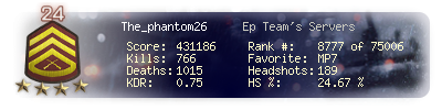 | Headshots | 189 | Suicides | 19 | Headshot / Kill | 24.67 % |