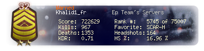 | Headshots | 164 | Suicides | 30 | Headshot / Kill | 16.96 % |