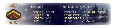 | Headshots | 8 | Suicides | 0 | Headshot / Kill | 28.57 % |