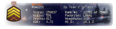 | Headshots | 107 | Suicides | 36 | Headshot / Kill | 18.1 % |