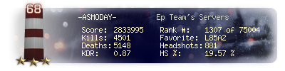 | Headshots | 881 | Suicides | 24 | Headshot / Kill | 19.57 % |