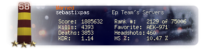 | Headshots | 460 | Suicides | 236 | Headshot / Kill | 10.47 % |