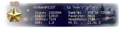 | Headshots | 2744 | Suicides | 15 | Headshot / Kill | 21.41 % |