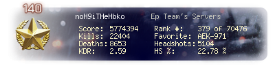 | Kills | 22404 | Deaths | 8653 | Kill / Death | 2.59 |