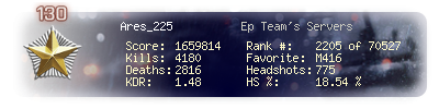 | Headshots | 775 | Suicides | 35 | Headshot / Kill | 18.54 % |
