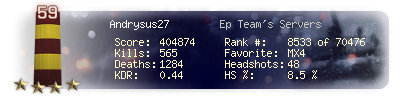 | Headshots | 48 | Suicides | 14 | Headshot / Kill | 8.5 % |