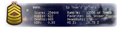 | Headshots | 179 | Suicides | 8 | Headshot / Kill | 28.78 % |