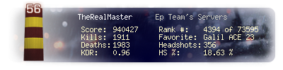 | Headshots | 356 | Suicides | 16 | Headshot / Kill | 18.63 % |