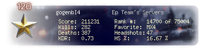 | Headshots | 47 | Suicides | 1 | Headshot / Kill | 16.67 % |