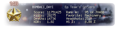 | Kills | 28275 | Deaths | 14736 | Kill / Death | 1.92 |