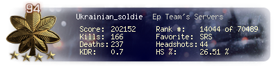 | Headshots | 44 | Suicides | 4 | Headshot / Kill | 26.51 % |