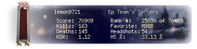 | Headshots | 54 | Suicides | 0 | Headshot / Kill | 33.13 % |