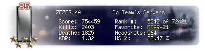 | Headshots | 37 | Suicides | 2 | Headshot / Kill | 20.44 % |