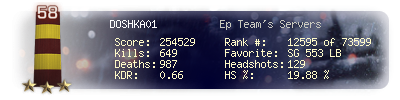 | Headshots | 129 | Suicides | 15 | Headshot / Kill | 19.88 % |