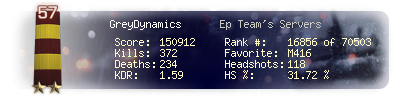 | Headshots | 118 | Suicides | 5 | Headshot / Kill | 31.72 % |