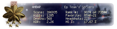 | Headshots | 16 | Suicides | 0 | Headshot / Kill | 6.15 % |