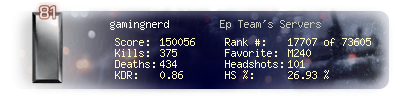 | Headshots | 14 | Suicides | 0 | Headshot / Kill | 23.73 % |