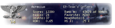 | Suicides | 0 | Headshots | 6 | Headshot / Kill | 25 % |