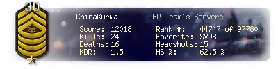 Suicides | 0 | Headshots | 15 | Headshot / Kill | 62.5 % |