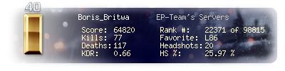 | Suicides | 2 | Headshots | 20 | Headshot / Kill | 25.97 % |