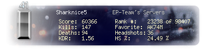 | Suicides | 1 | Headshots | 36 | Headshot / Kill | 24.49 % |