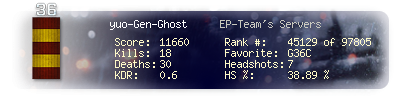 Suicides | 0 | Headshots | 7 | Headshot / Kill | 38.89 % |