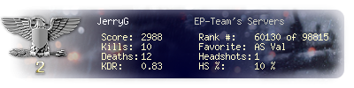 | Suicides | 0 | Headshots | 1 | Headshot / Kill | 10 % |