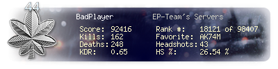 | Suicides | 2 | Headshots | 43 | Headshot / Kill | 26.54 % |