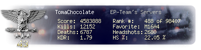 | Kills | 12152 | Deaths | 6787 | Kill / Death | 1.79 |