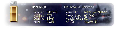 | Kill-streak | 5 | Death-streak | 35 | Team Kills | 0 |