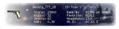 | Suicides | 1 | Headshots | 13 | Headshot / Kill | 40.63 % |