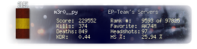Suicides | 11 | Headshots | 97 | Headshot / Kill | 25.94 % |