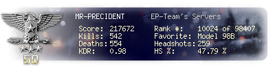 | Suicides | 2 | Headshots | 259 | Headshot / Kill | 47.79 % |