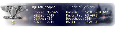 | Suicides | 2 | Headshots | 264 | Headshot / Kill | 25.91 % |