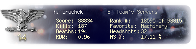 | Kill-streak | 15 | Death-streak | 7 | Team Kills | 0 |