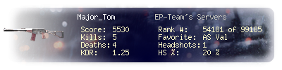 | Suicides | 0 | Headshots | 1 | Headshot / Kill | 20 % |